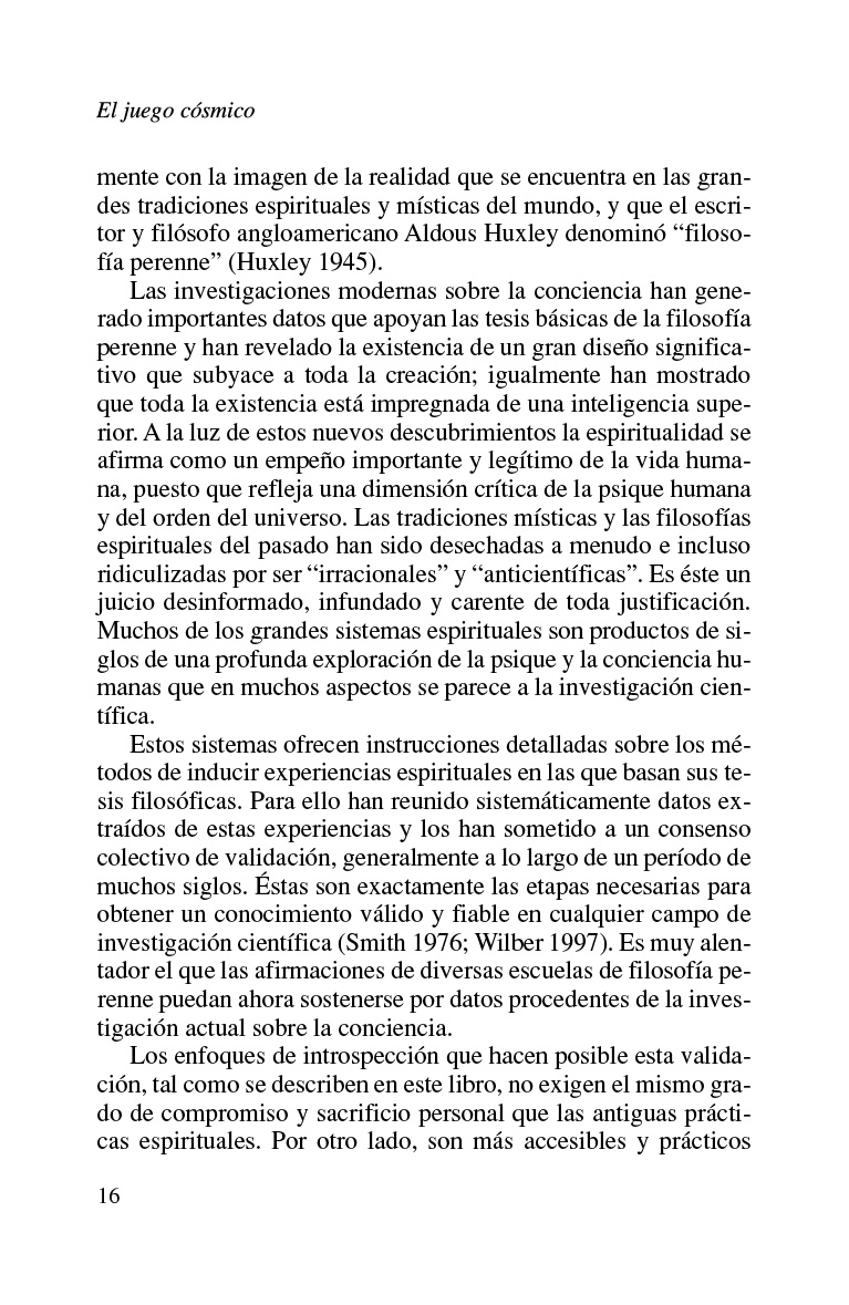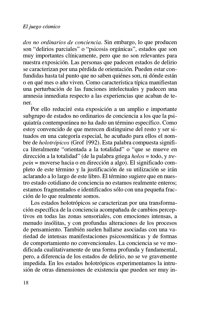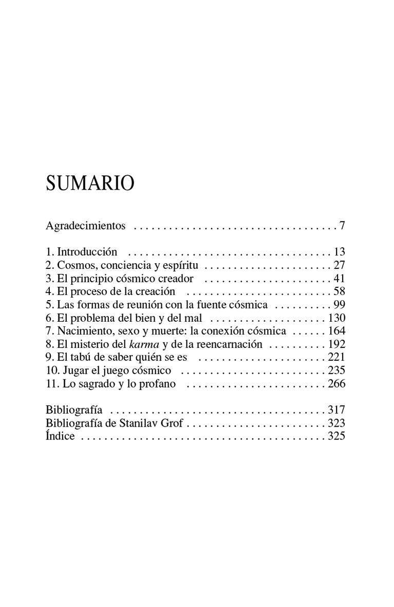 En El juego cósmico, Stanislav Grof desarrolla sus más amplias concepciones filosóficas y espirituales, abordando aquellas cuestiones fundamentales de la existencia que desde tiempos inmemoriales se han planteado los seres humanos.En El juego cósmico se arranca de los estados no ordinarios de conciencia y se describe la realidad como un juego asombroso del principio cósmico creador que trasciende el tiempo, el espacio, la causalidad lineal y todo tipo de polaridades; un juego que sugiere que la psique individual, cuando alcanza su máximo potencial, posee la misma identidad que el principio creador universal y la totalidad de la existencia. Esta identidad transpersonal es el secreto y el núcleo de las grandes tradiciones espirituales.Algunas opiniones sobre El juego cósmico: Lo que hace del libro de Grof un clásico es que concuerda sustancialmente con la gran sabiduría del mundo y con sus tradiciones espirituales. Esta confirmación moderna de la filosofía perenne es un logro fenomenal que merece ser difundido lo más ampliamente posible. Ken Wilber El juego cósmico tal vez sea la obra más importante de Grof, pues supone una integración de las experiencias más decisivas de sus clientes y demuestra una convergencia notable con las experiencias espirituales más profundas, sedimentadas a lo largo de los siglos y de las culturas. Esta convergencia es un hallazgo enormemente significativo. Roger Walsh Grof es una autoridad mundial en la exploración de la mente y del alma... íEste libro es un regalo maravilloso! Charles Tart