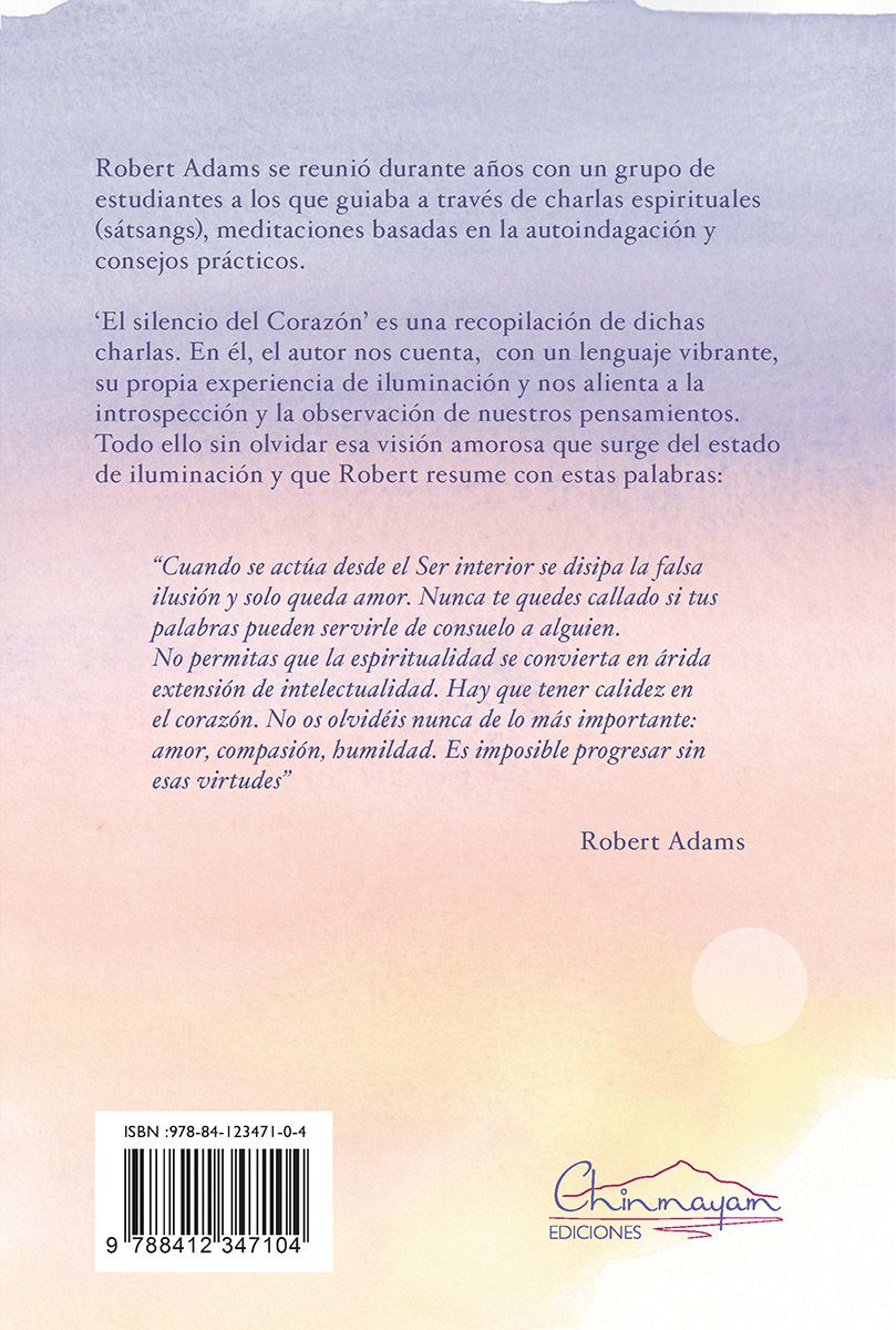 Robert Adams se reunió durante años con un grupo de estudiantes a los que guiaba a través de charlas espirituales (sátsangs), meditaciones basadas en la autoindagación y consejos prácticos. El silencio del Corazón es una recopilación de dichas charlas. En él, el autor nos cuenta, con un lenguaje vibrante, su propia experiencia de iluminación y nos alienta a la introspección y la observación de nuestros pensamientos. Todo ello sin olvidar esa visión amorosa que surge del estado de iluminación y que Robert resume con estas palabras: Cuando se actúa desde el Ser interior se disipa la falsa ilusión y solo queda amor. Nunca te quedes callado si tus palabras pueden servirle de consuelo a alguien. No permitas que la espiritualidad se convierta en árida extensión de intelectualidad. Hay que tener calidez en el corazón. No os olvidéis nunca de lo más importante: amor, compasión, humildad. Es imposible progresar sin esas virtudes Robert Adams