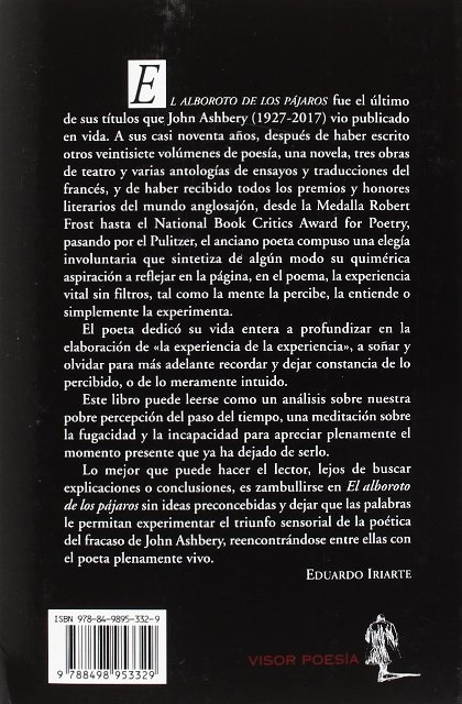 El ALBOROTO DE LOS P JAROS fue el último de sus títulos que John Ashbery (1927-2017) vio publicado en vida. A sus casi noventa años, después de haber escrito otros veintisiete volúmenes de poesía, una novela, tres obras de teatro y varias antologías de ensayos y traducciones del francés, y de haber recibido todos los premios y honores literarios del mundo anglosajón, desde la Medalla Robert Frost hasta el National Book Critics Award for Poetry, pasando por el Pulitzer, el anciano poeta compuso una elegía involuntaria que sintetiza de algún modo su quimérica aspiración a reflejar en la página, en el poema, la experiencia vital sin filtros, tal como la mente la percibe, la entiende o simplemente la experimenta. El poeta dedicó su vida entera a profundizar en la elaboración de "la experiencia de la experiencia", a soñar y olvidar para más adelante recordar y dejar constancia de lo percibido, o de lo meramente intuido. Este libro puede leerse como un análisis sobre nuestra pobre percepción del paso del tiempo, una meditación sobre la fugacidad y la incapacidad para apreciar plenamente el momento presente que ya ha dejado de serlo. Lo mejor que puede hacer el lector, lejos de buscar explicaciones o conclusiones, es zambullirse en El alboroto de los pájaros sin ideas preconcebidas y dejar que las palabras le permitan experimentar el triunfo sensorial de la poética del fracaso de John Ashbery, reencontrándose entre ellas con el poeta plenamente vivo. EDUARDO IRIARTE