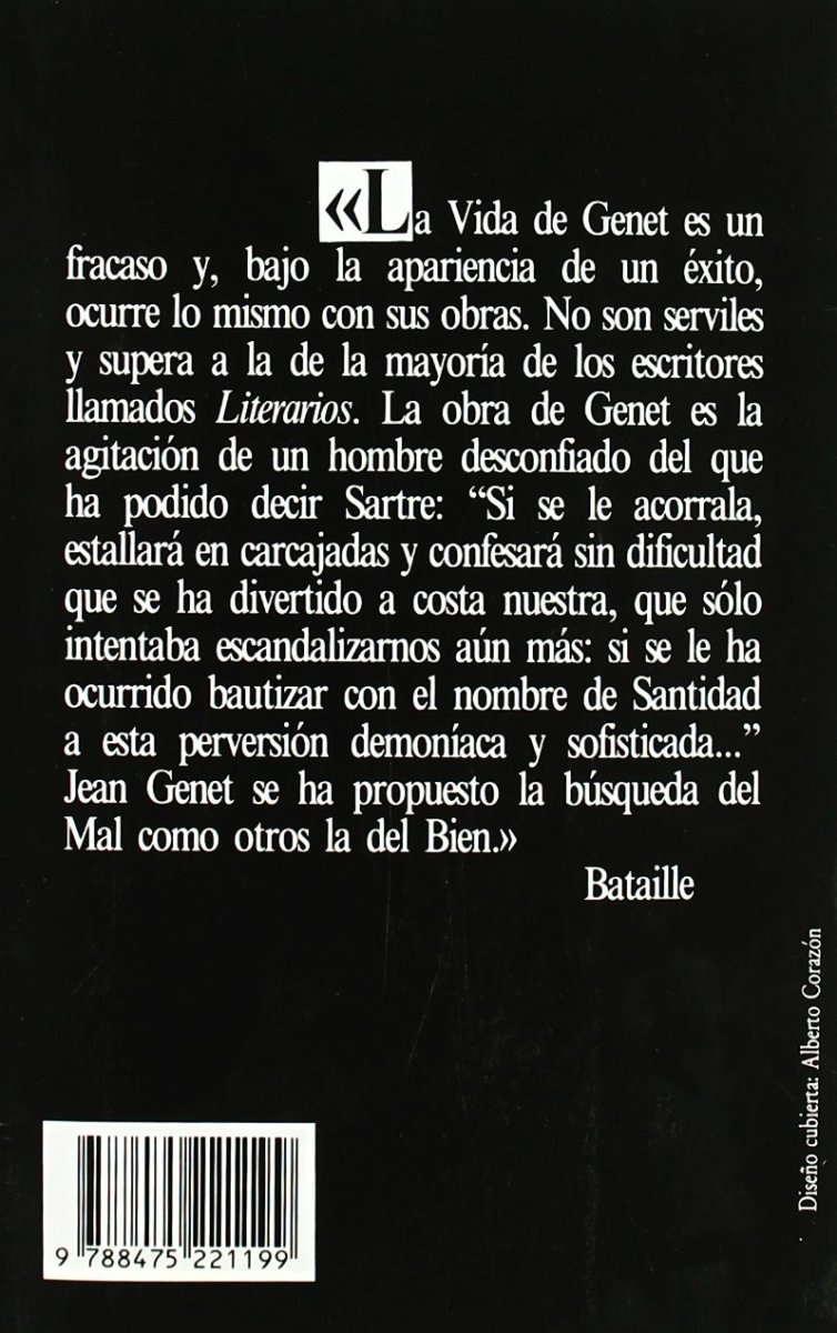 La vida de Genet es un fracaso y, bajo la apariencia de un éxito, ocurre lo mismo con sus obras. No son serviles y supera a la mayoría de los escritores llamados Literarios. La obra de Genet es la agitación de un hombre desconfiado del que ha podido decir Sartre: -- Si se le acorrala, estallará en carcajadas y confesará sin dificultad que se ha divertido a costa nuestra, que sólo intentaba escandalizarnos aún más: si se le ha ocurrido bautizar con el nombre de Santidad a esta perversión demoníaca y sofisticada...-- Jean Genet se ha propuesto la búsqueda del Mal otros la del Bien". Bataille.