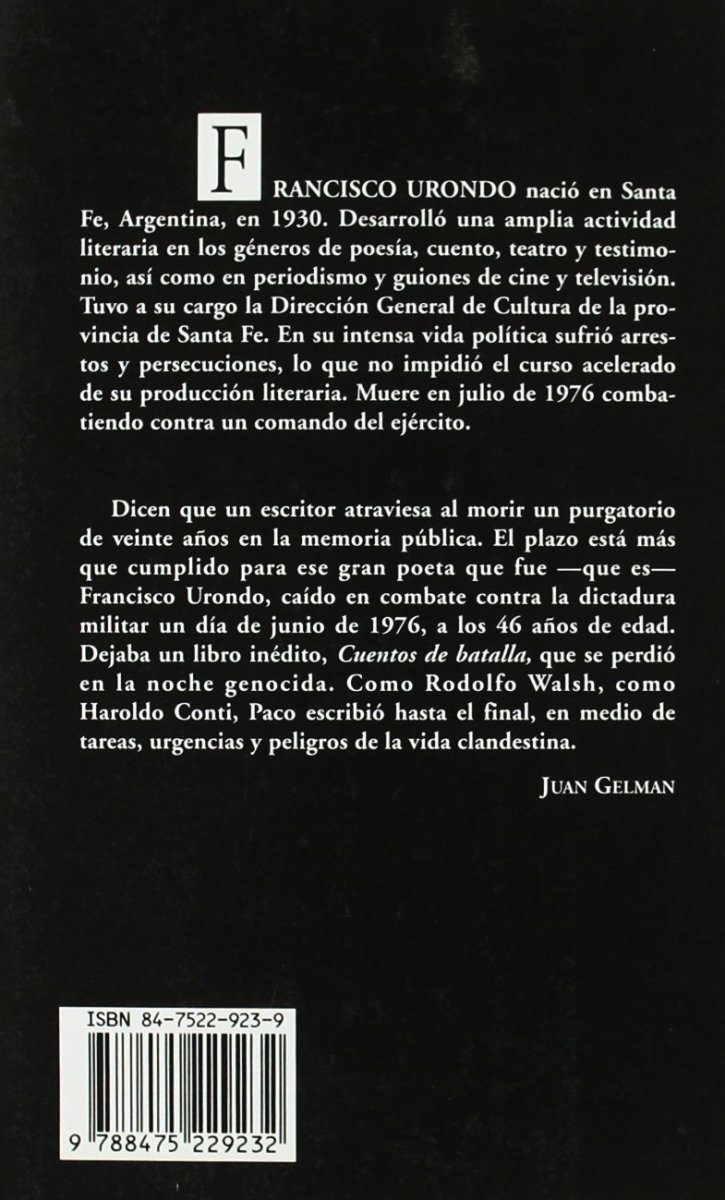 Dicen que un escritor atraviesa al morir un purgatorio de veinte años en la memoria pública. El plazo está más que cumplido para ese gran poeta que fue -que es- Francisco Urondo, caído en combate contra la dictadura militar un día de junio de 1976, a los 46 años de edad. Dejaba un libro inédito, Cuentos de batalla, que se p erdió en la noche genocida. Como Rodolfo Walsh, como Haroldo Conti, Paco escribió hasta el final, en medio de tareas, urgencias y peligros de la vida clandestina.Epílogo de Mario Benedetti.