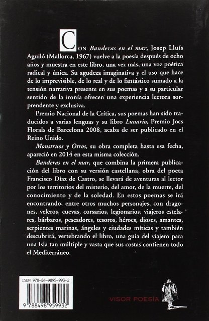 Con Banderas en el mar, Josep Lluís Aguiló (Mallorca, 1967) vuelve a la poesía después de ocho años y muestra en este libro, una vez más, una voz poética radical y única. Su agudeza imaginativa y el uso que hace de lo imprevisible, de lo real y de lo fantástico sumado a la tensión narrativa presente en sus poemas y a su particular sentido de la ironía ofrecen una experiencia lectora sorprendente y exclusiva. Premio Nacional de la Crítica, sus poemas han sido traducidos a varias lenguas y su libro Lunario, Premio Jocs Florals de Barcelona 2008, acaba de ser publicado en el Reino Unido. Monstruos y Otros, su obra completa hasta esa fecha, apareció en 2014 en esta misma colección. Banderas en el mar, que combina la primera publicación del libro con su versión castellana, obra del poeta Francisco Díaz de Castro, se llevará de aventuras al lector por los territorios del misterio, del amor, de la muerte, del conocimiento y de la soledad. En estos poemas se irá encontrando, entre otros muchos personajes, con dragones, veleros, cuevas, corsarios, legionarios, viajeros estelares, bárbaros, pescadores, tesoros, héroes, dioses, amantes, serpientes marinas, ángeles y ciudades míticas y también descubrirá, vertebrando el libro, una guía del viajero para una Isla tan múltiple y vasta que sus costas contienen todo el Mediterráneo.