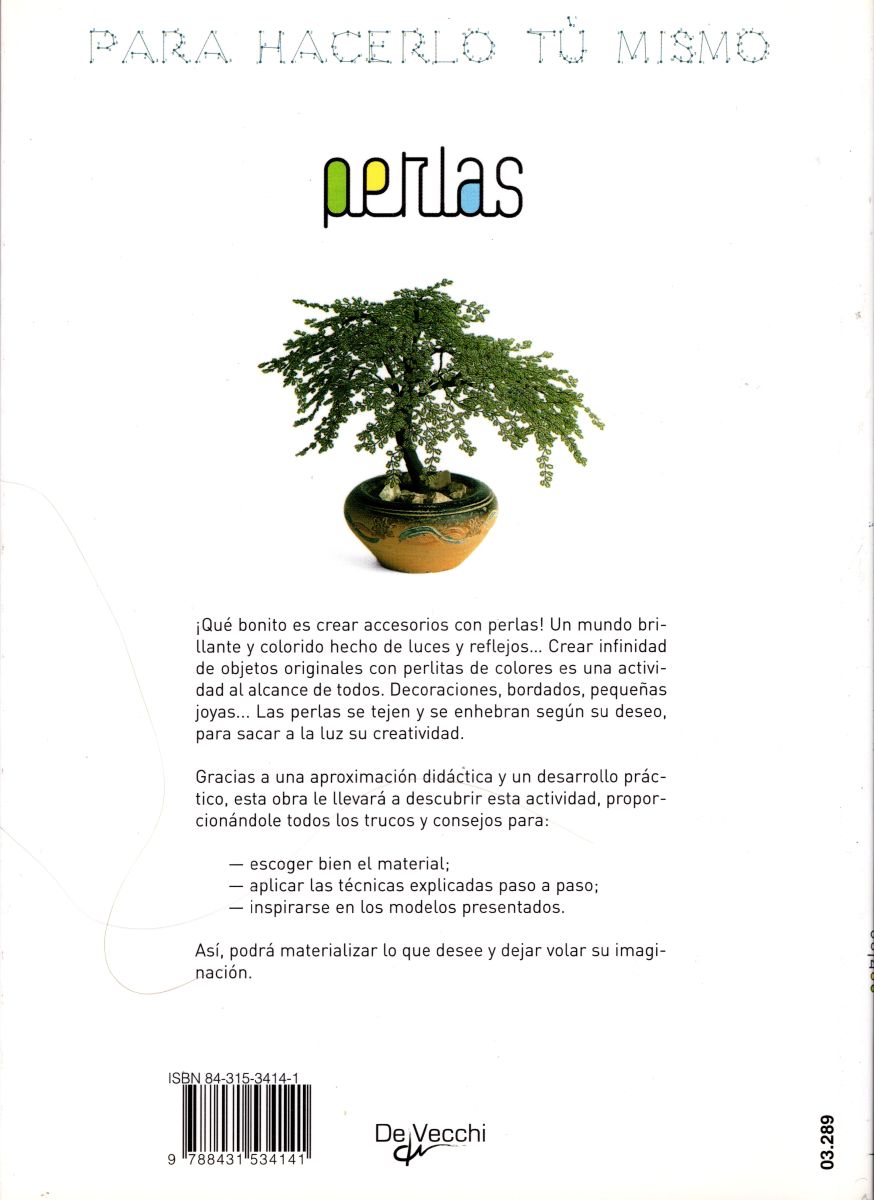 Qué bonito es crear accesorios con perlas! Un mundo brillante y colorido hecho de luces y reflejos... Crear infinidad de objetos originales con perlitas de colores es una actividad al alcance de todos. Decoraciones, bordados, pequeñas joyas... Las perlas se tejen y se enhebran según su deseo, para sacar a la luz su creatividad. Gracias a una aproximación didáctica y un desarrollo prác tico, esta obra le llevará a descubrir esta actividad, proporcionándole todos los trucos y consejos para: - escoger bien el material; - aplicar las técnicas explicadas paso a paso; - inspirarse en los modelos presentados. Así, podrá materializar lo que desee y dejar volar su imaginación.