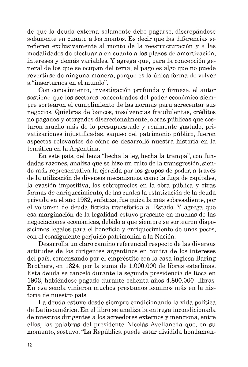 LA DEUDA EXTERNA, esa "esclavitud del tercer milenio" como la definiera alguien, no solo se ha consolidado como un verdadero sistema cuyos únicos beneficiarios son las grandes instituciones financieras, sino que ha logrado modificar el orden jurídico internacional, al extremo de haber dejado de lado el concepto de soberanía absoluta de los estados, que ahora son considerados como vulgares comerciantes que pueden ser juzgados en cualquier jurisdicción ordinaria. El estado de derecho ha cedido ante el avance del capitalismo depredador, habiéndose consagrado la impunidad del sistema a través de una estructura legal acorde a todas sus imposiciones, donde el FMI es el único organismo inmune a cualquier acción jurisdiccional, con una jerarquía superior a la que tiene cualquier Estado soberano. En el libro se muestran las evidencias que obran en las investigaciones sobre la deuda que tramitan en los tribunales federales respecto al sector privado y a las responsabilidades de los funcionarios públicos, planteándose algunas cuestiones jurídicas no demasiado debatidas, que están inescindiblemente relacionadas con las obligaciones externas. El autor pone en evidencia la subordinación de los organismos del Estado a las decisiones y los planes instrumentados por el sistema financiero a partir de la dictadura militar, y su continuidad a través de los gobiernos de la democracia, sosteniendo que mientras no se cambie esa estructura legal de la dependencia, la deuda seguirá siendo el gran problema de la economía argentina.