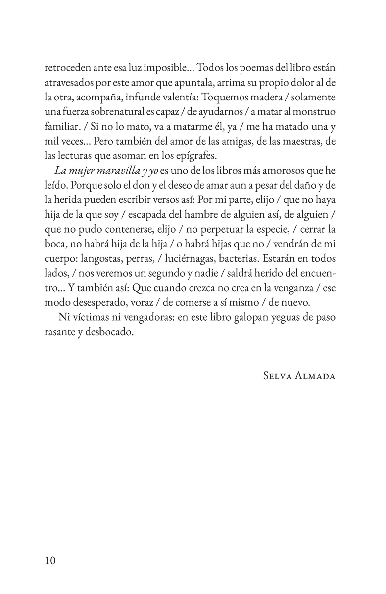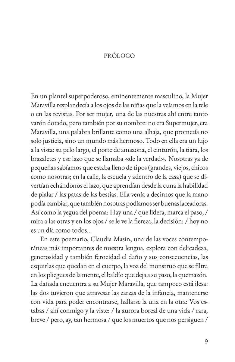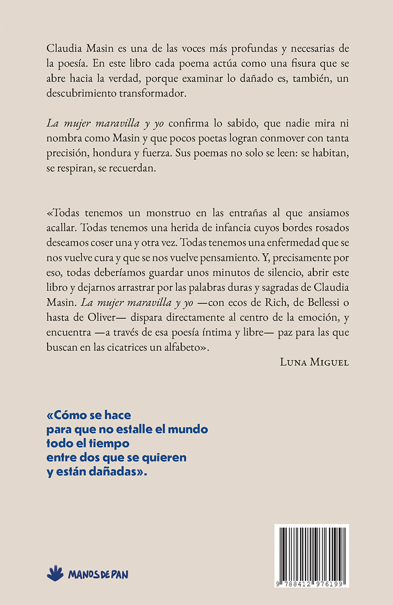 Claudia Masin es una de las voces más profundas y necesarias de la poesía. En este libro cada poema actúa como una fisura que se abre hacia la verdad, porque examinar lo dañado es, también, un descubrimiento transformador. La mujer maravilla y yo confirma lo sabido, que nadie mira ni nombra como Masin y que pocos poetas logran conmover con tanta precisión, hondura y fuerza. Sus poemas no solo se leen: se habitan, se respiran, se recuerdan. Todas tenemos un monstruo en las entrañas al que ansiamos acallar. Todas tenemos una herida de infancia cuyos bordes rosados deseamos coser una y otra vez. Todas tenemos una enfermedad que se nos vuelve cura y que se nos vuelve pensamiento. Y, precisamente por eso, todas deberíamos guardar unos minutos de silencio, abrir este libro y dejarnos arrastrar por las palabras duras y sagradas de Claudia Masin. La mujer maravilla y yo con ecos de Rich, de Bellessi o hasta de Oliver dispara directamente al centro de la emoción, y encuentra a través de esa poesía íntima y libre paz para las que buscan en las cicatrices un alfabeto . Luna Miguel