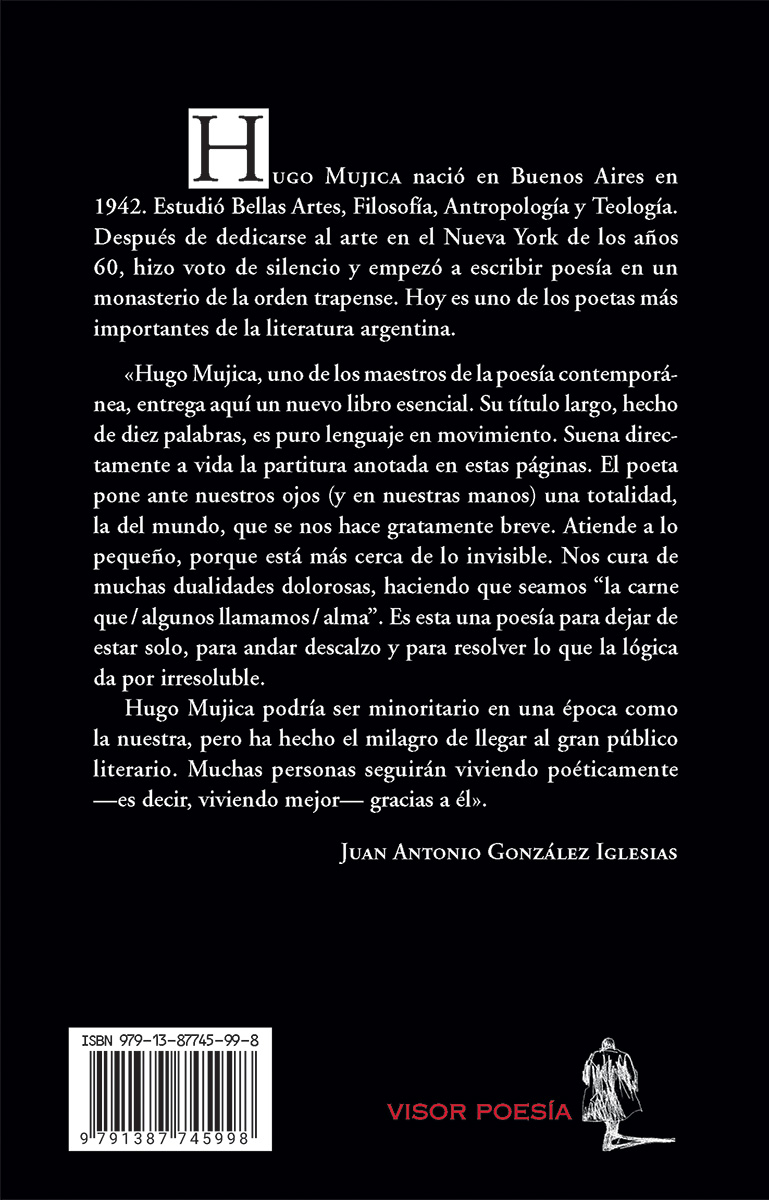 Hugo Mujica nació en Buenos Aires en 1942. Estudió Bellas Artes, Filosofía, Antropología y Teología. Después de dedicarse al arte en el Nueva York de los años 60, hizo voto de silencio y empezó a escribir poesía en un Monasterio de la orden trapense. Hoy es uno de los poetas más importantes de la literatura argentina. Hugo Mujica, uno de los maestros de la poesía contemporánea, entrega aquí un nuevo libro esencial. Su título largo, hecho de diez palabras, es puro lenguaje en movimiento. Suena directamente a vida la partitura anotada en estas páginas. El poeta pone ante nuestros ojos (y en nuestras manos) una totalidad, la del mundo, que se nos hace gratamente breve. Atiende a lo pequeño, porque está más cerca de lo invisible. Nos cura de muchas dualidades dolorosas, haciendo que seamos la carne que / algunos llamamos / alma . Es esta una poesía para dejar de estar solo, para andar descalzo y para resolver lo que la lógica da por irresoluble. Hugo Mujica podría ser minoritario en una época como la nuestra, pero ha hecho el milagro de llegar al gran público literario. Muchas personas seguirán viviendo poéticamente es decir, viviendo mejor gracias a él . Juan Antonio González Iglesias